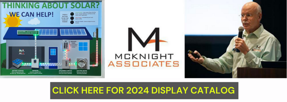 The center section has various color LED strips that show the flow of power. Buttons at the top allow solar power, grid power, and battery power (or all three) to be demonstrated.